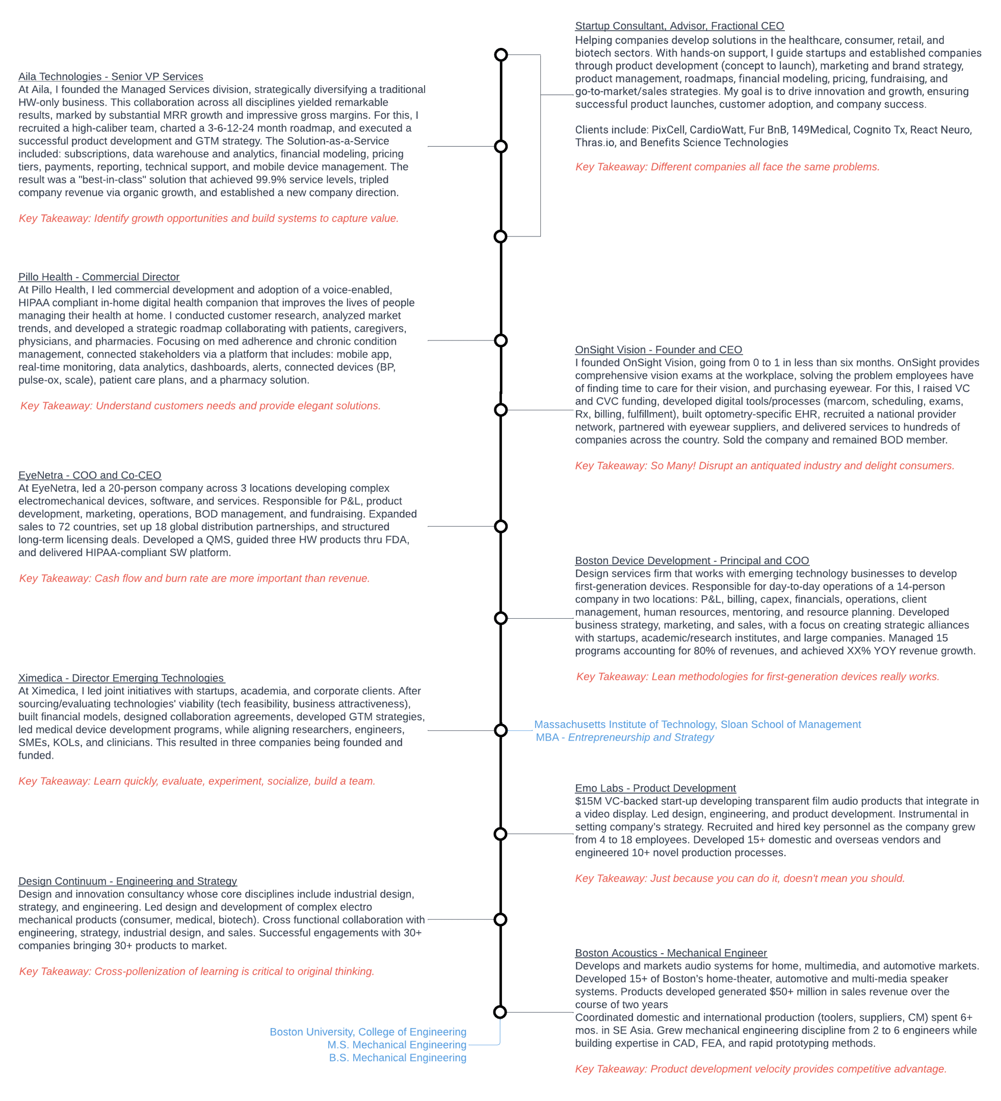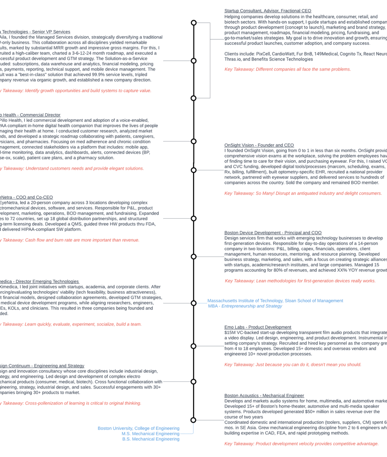 Led a 20-person company across 3 locations developing complex electromechanical devices, software, and services. Responsible for P&L, product development, marketing, operations, BOD management, and fundraising. Developed a quality management system, guided three HW products thru FDA, and delivered HIPAA-compliant SW platform.